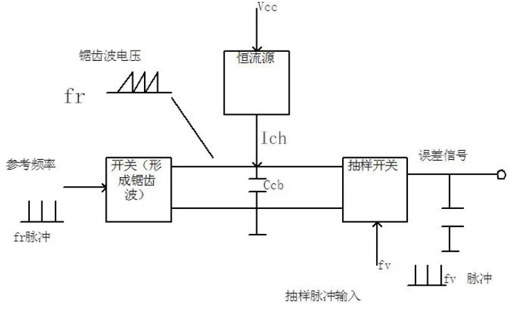 首先,将参考标准频率ƒr和VCO的频率ƒv的电压都形成脉冲。频率为ƒr的脉冲用来控制一个开关电路,使电容Ccb产生周期性的充、放电,形成如下图 (a) 的锯齿形波电压:
