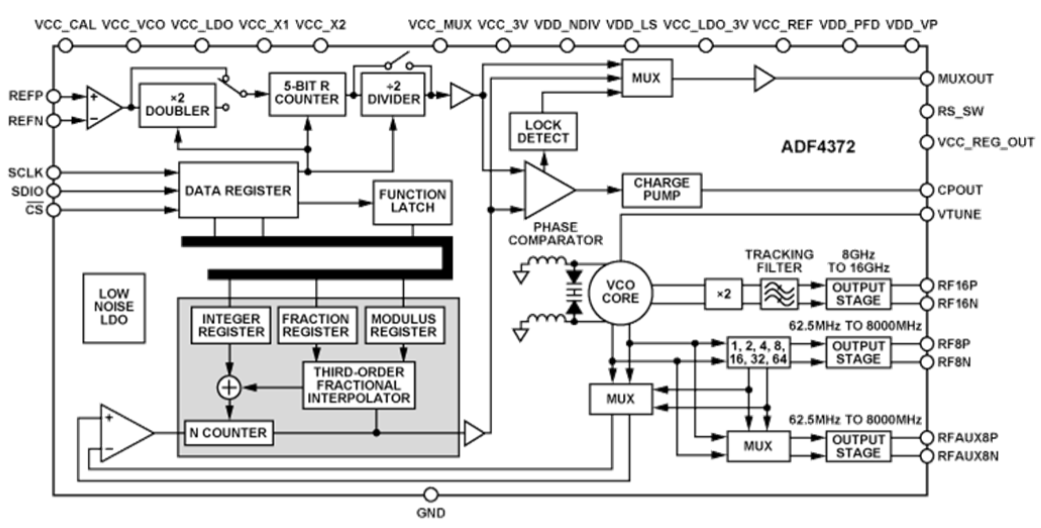 ADF4372 结合外部环路滤波器和外部基准频率使用时,可实现小数 N 分频或整数 N 分频锁相环 (PLL) 频率合成器。宽带微波压控振荡器 (VCO) 设计允许产生 62.5 MHz 至 16 GHz 的频率。ADF4372 具有一个集成 VCO,其基本输出频率范围为 4000 MHz 至 8000 MHz。