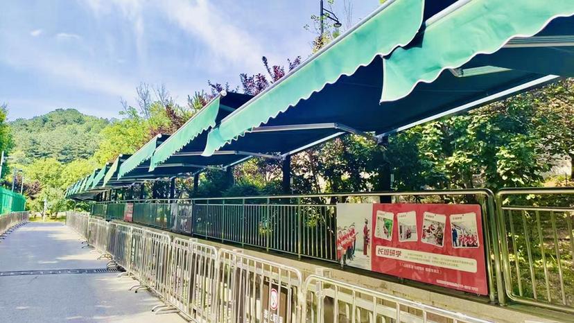 为应对暑期高温,八达岭长城景区推出全方位“清凉游”保障体系。景区南北索道加装防晒、防雨遮阳棚。其中,北线人避暑等候。此外,南线米长的电动伸缩遮阳帘,可同时容纳约300人乘凉等候。大面积的遮阳设施,让游客在炎炎夏日多了一方清凉天地。