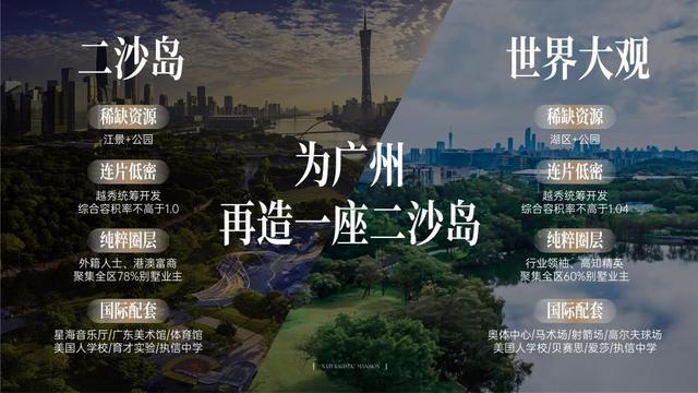 皆因两者坐拥「稀缺生态资源」——二沙岛拥江景与公园,世界大观则享湖区与公园环绕;均采用「连片低密开发」模式,由越秀统一运营,板块综合容积率低至约1.04;「圈层纯粹」,二沙岛以外籍人士、港澳富商、行业领袖为主,世界大观则以互联网IT新贵、高知精英等为主,业主圈层高度一致;更同样具备「国际配套」,二沙岛拥有星海音乐厅、广东美术馆、美国人学校和执信中学,世界大观则汇聚奥体中心、美国人学校、贝赛思和执信中学等资源。
