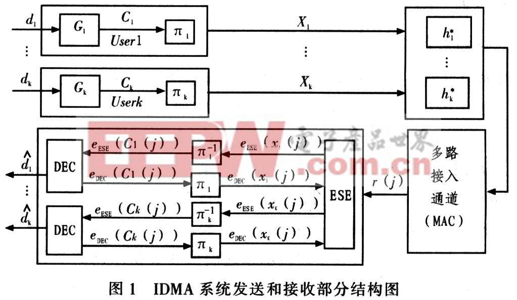 图1为IDMA通信系统发送和接收部分的结构图。该系统发送端包括K个用户,第k个用户发送的码元序列为:dk=[dk(1),…,dk(i),…,dk(I)](I为发送序列码元长度),经码长为S的重复编码扩频得到序列为:Gk=[Gk(1),…,Gk(j),…,Gk(J)],J为扩频后的码长,再经交织器打乱顺序重排后成为发送序列为:Xk=[xk(1),…,xk(j),…xk(J)]。