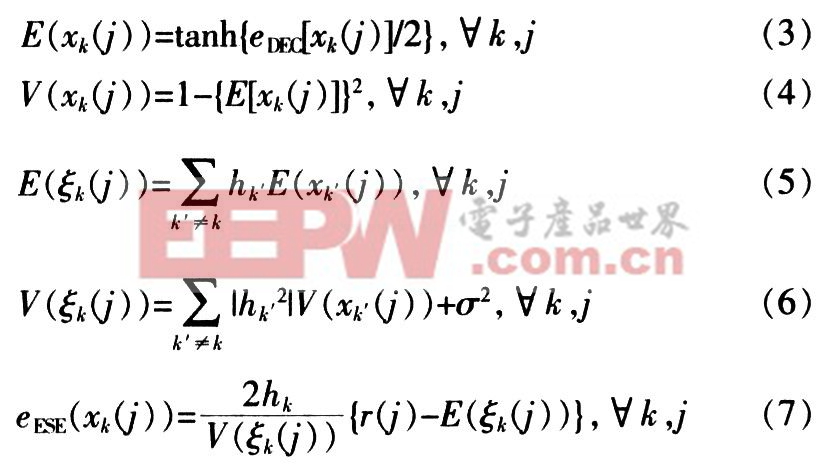 系统接收端采用Turbo型迭代译码结构,主要由基本信号检测器ESE、解交织器和K个用户译码器DEC组成。系统中考虑完全同步无记忆信道,接收信号r(j)表示为:
